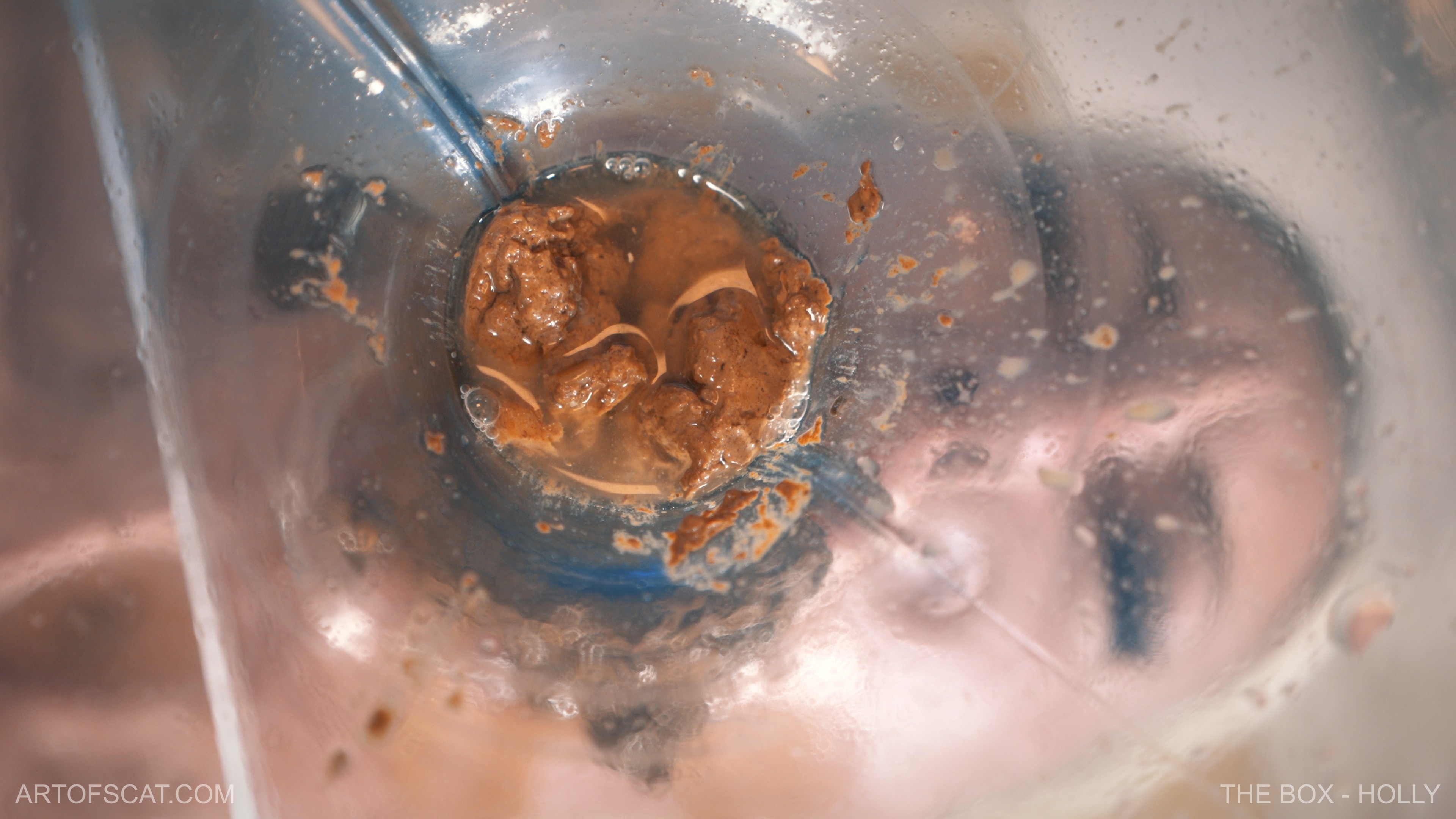 Holly realized she was much more of a pervert than she'd ever imagined. After her last movie, where she took her first shit load in her mouth, she begged me to let her do the box session. Her mistress was Nazryana this time, stuffed full for the occasion. Holly's head was placed inside a small plexiglass box, and above her spread-eagle mouth was a transparent feeding funnel-tube that doubled as a shitting chair. Nazryana produced so much waste that it clogged the pipe, but when she started peeing, it quickly flushed out the shit, sending diluted waste down Holly’s throat. Then Nazryana moved to the side and began scooping shit from the box into Holly’s mouth using her own filthy foot, pushing it down her throat. Finally, Holly got a vibe and had two orgasms while being scat-mouth-foot-fisted.